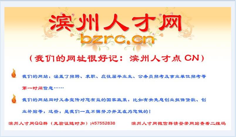 找工作到滨州人才网(bzrc.cn),聘人才到滨州人才网(bzrc.cn),登录滨州人才网,人才免费注册免费用,海量岗位任你选!企业免费注册,在微信朋友圈连续转发本文章3天,企业即可免费开通1个月正式会员,无限制免费刷新,海量人才库,总有人才适合您。滨州人自己的免费求职招聘站,同时网站涵盖各类招考招聘(公务员、事业单位等)第一时间信息以及免息创业担保贷款和创业补贴等国家普惠政策信息!何必去五八,无需去赶集!更多的关注将在这里继续,更多的精彩将在这里诞生!